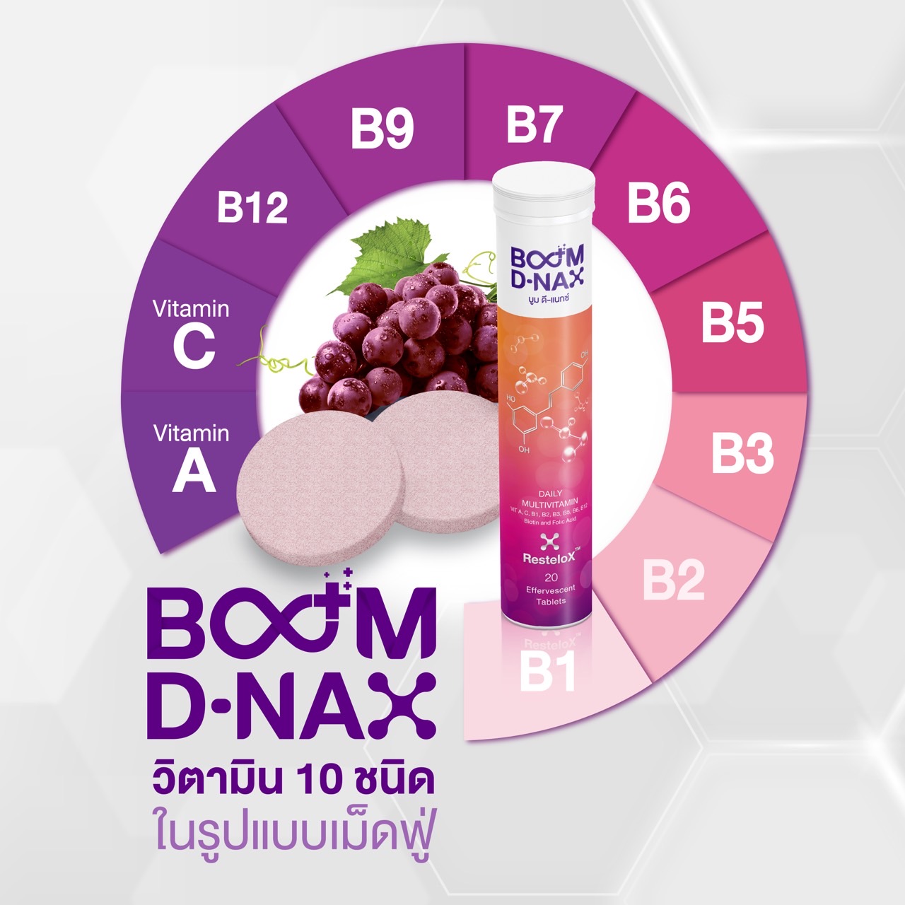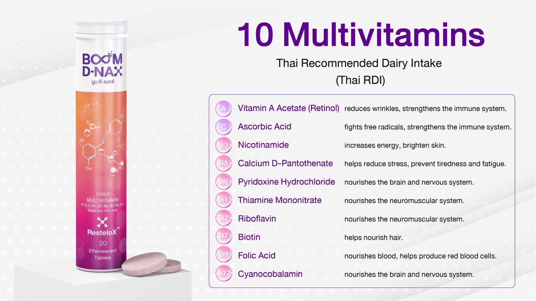 Boom D-Nax is a sugarless dietary supplement drink that comes in the form of effervescent tablets.